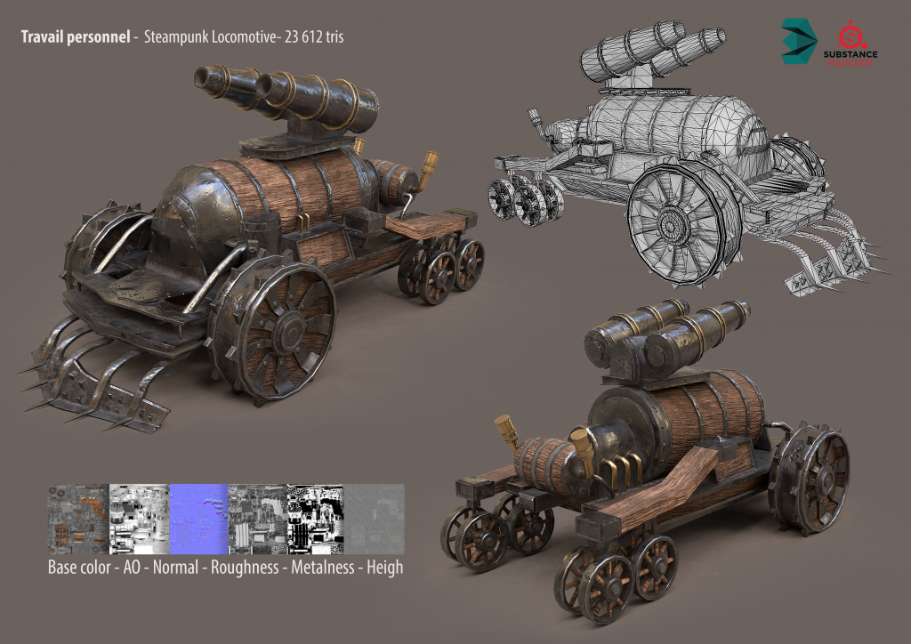 Projet 3D d’un tank au style « Steampunk ». Ce model a été réalisé à partir d’un concept art conçu pour le jeu de Kingdom Under Fire II. Modélisé sur 3ds Max et texturé sur Subtance Painter.